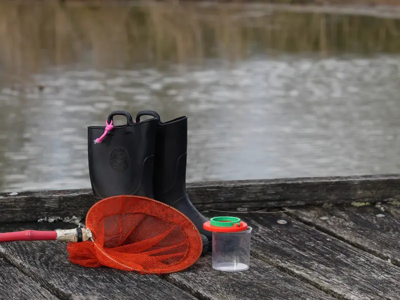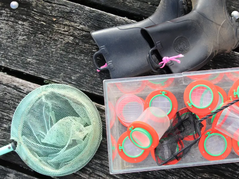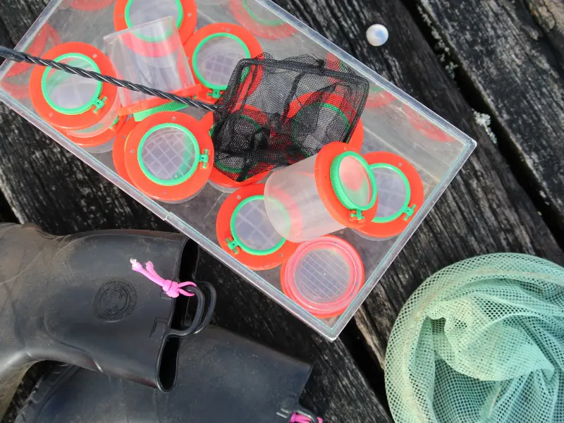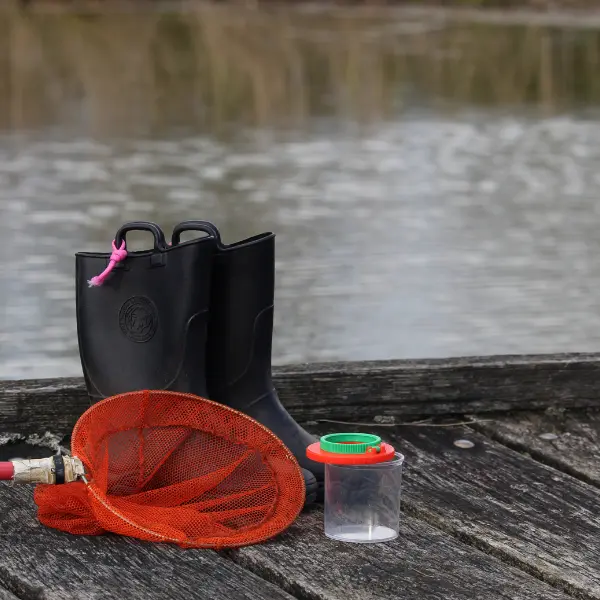 Nous te prêtons épuisettes, boîtes loupes, et fiches d'identification pour identifier cette faune aquatique.
